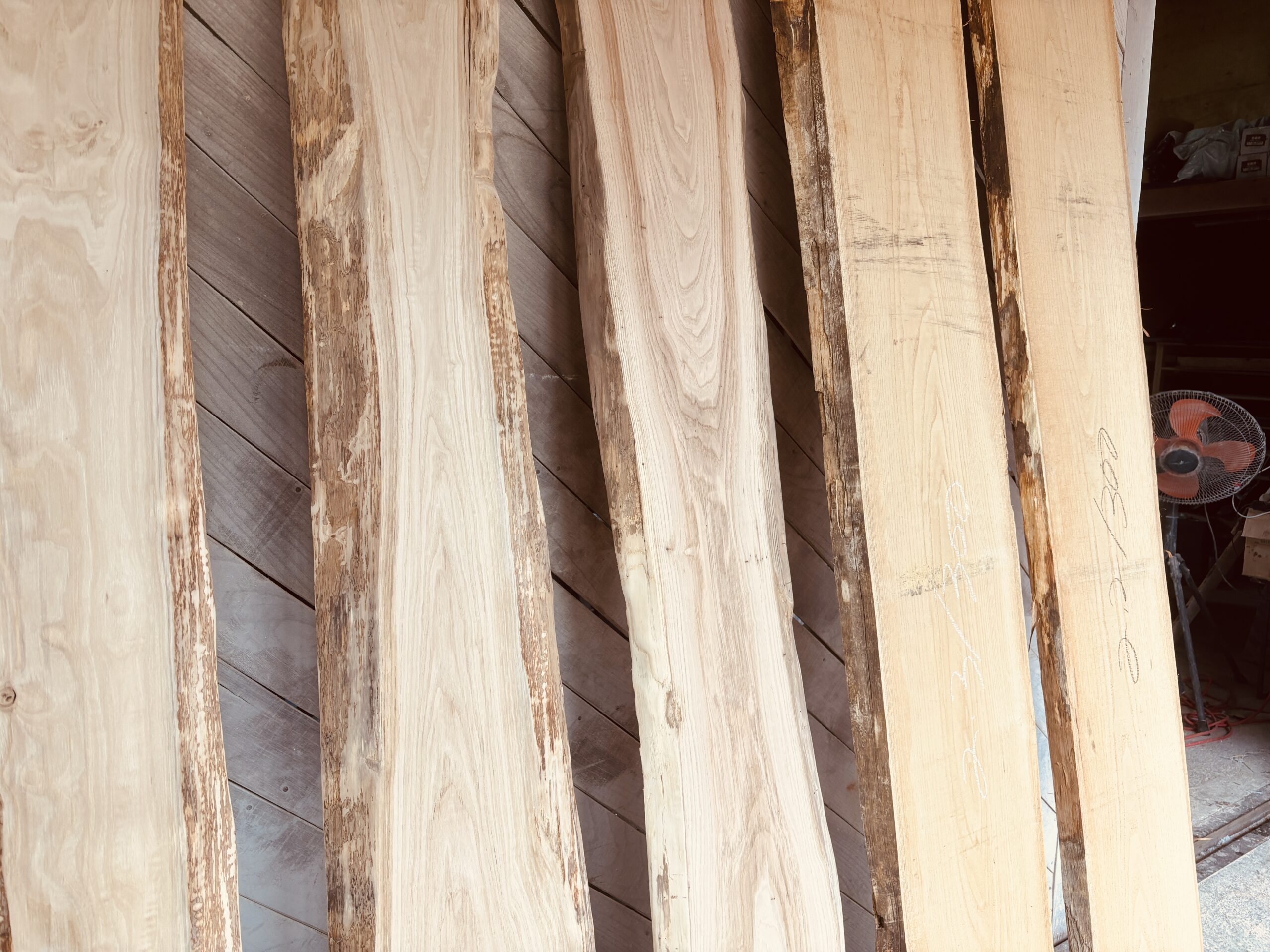 チェスナット(クリ・栗)の両耳付き一枚板を6枚仕入れた様子。幅300〜400mm、長さ2200〜2400mmの素材が並ぶ チェスナット(クリ / 栗)