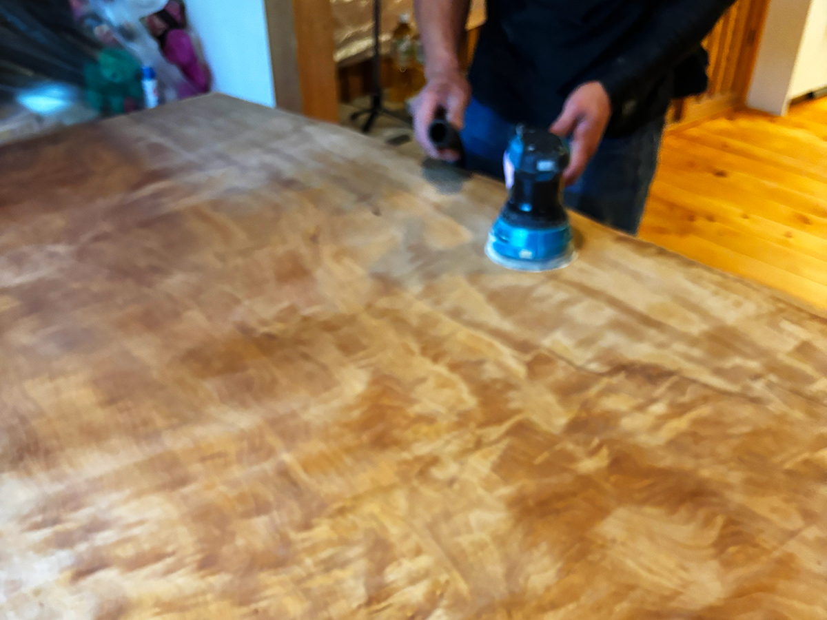 栃の一枚板テーブルをオービタルサンダーで磨き直している作業風景。表面の色ムラを均一に整えている工程。