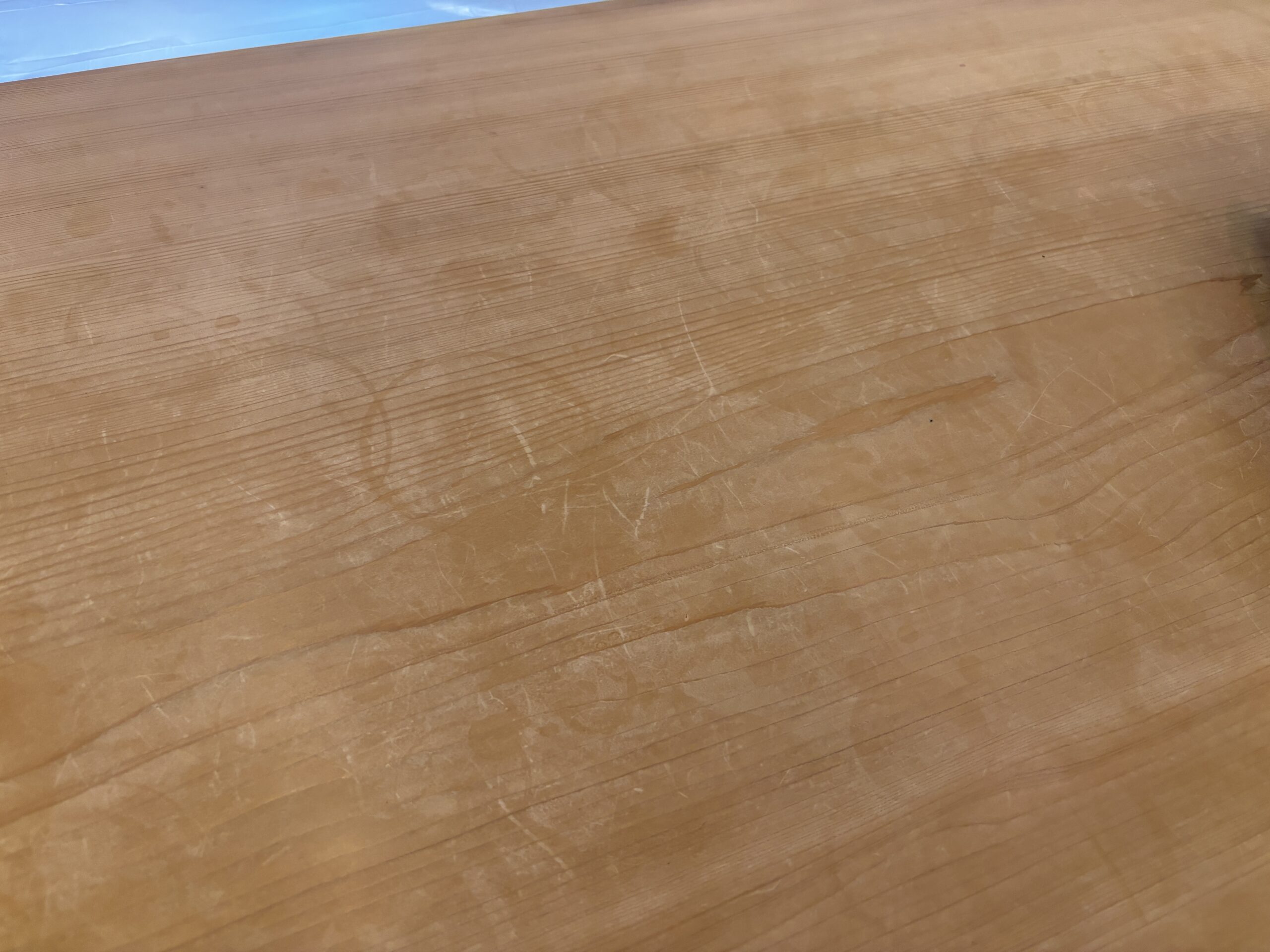 今回のヒノキカウンターは、表面には傷や白化、汚れが見られましたが、構造的な割れはなく、厚みも十分に残っていました。劣化の原因はあくまで表面の使い込みによるもので、木そのものの力は健全な状態です。このようなケースでは、研磨によって機能面・意匠面ともに回復が見込めます。