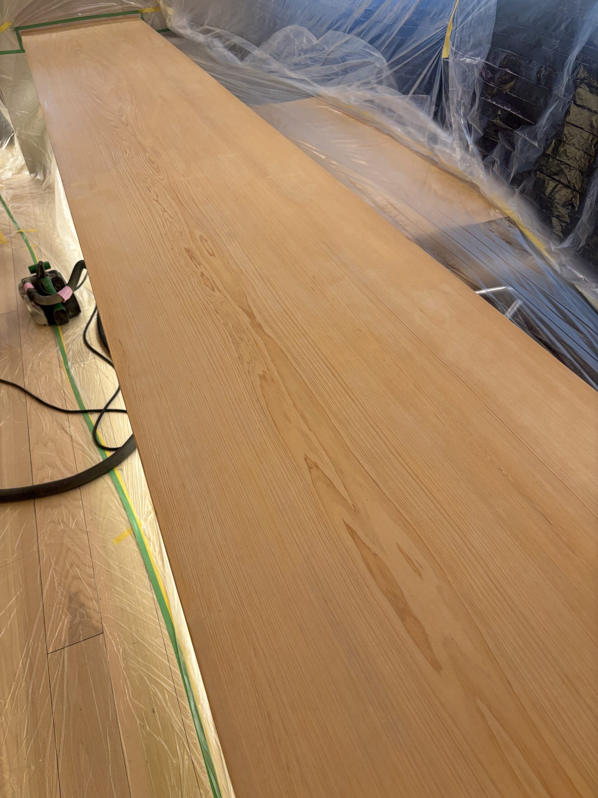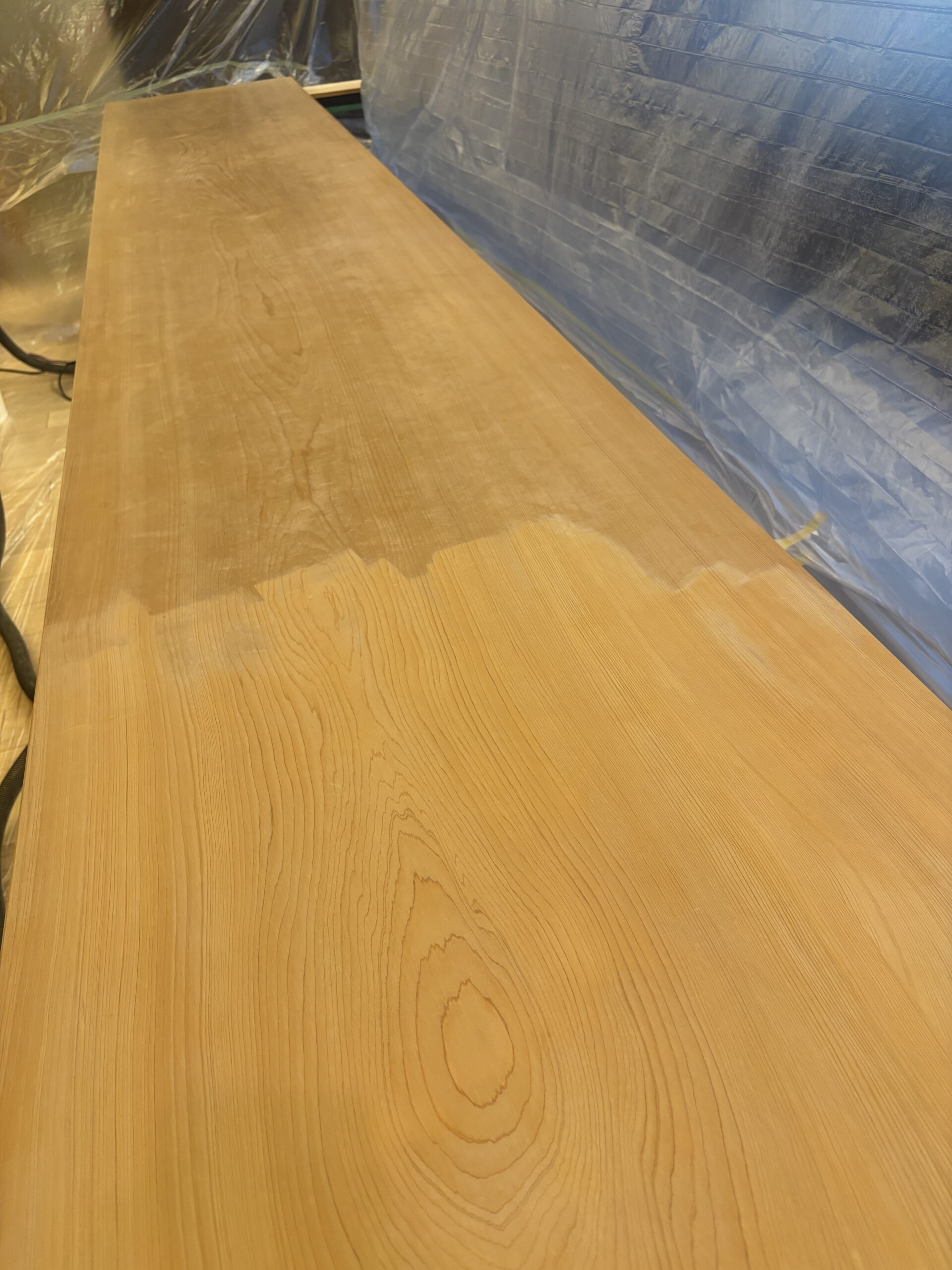 表面のくすみが取れるにつれ、ヒノキ特有のやわらかな色味が戻り、触れたときの手触りも均一に整っていきます。