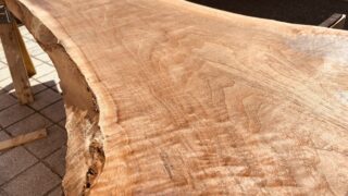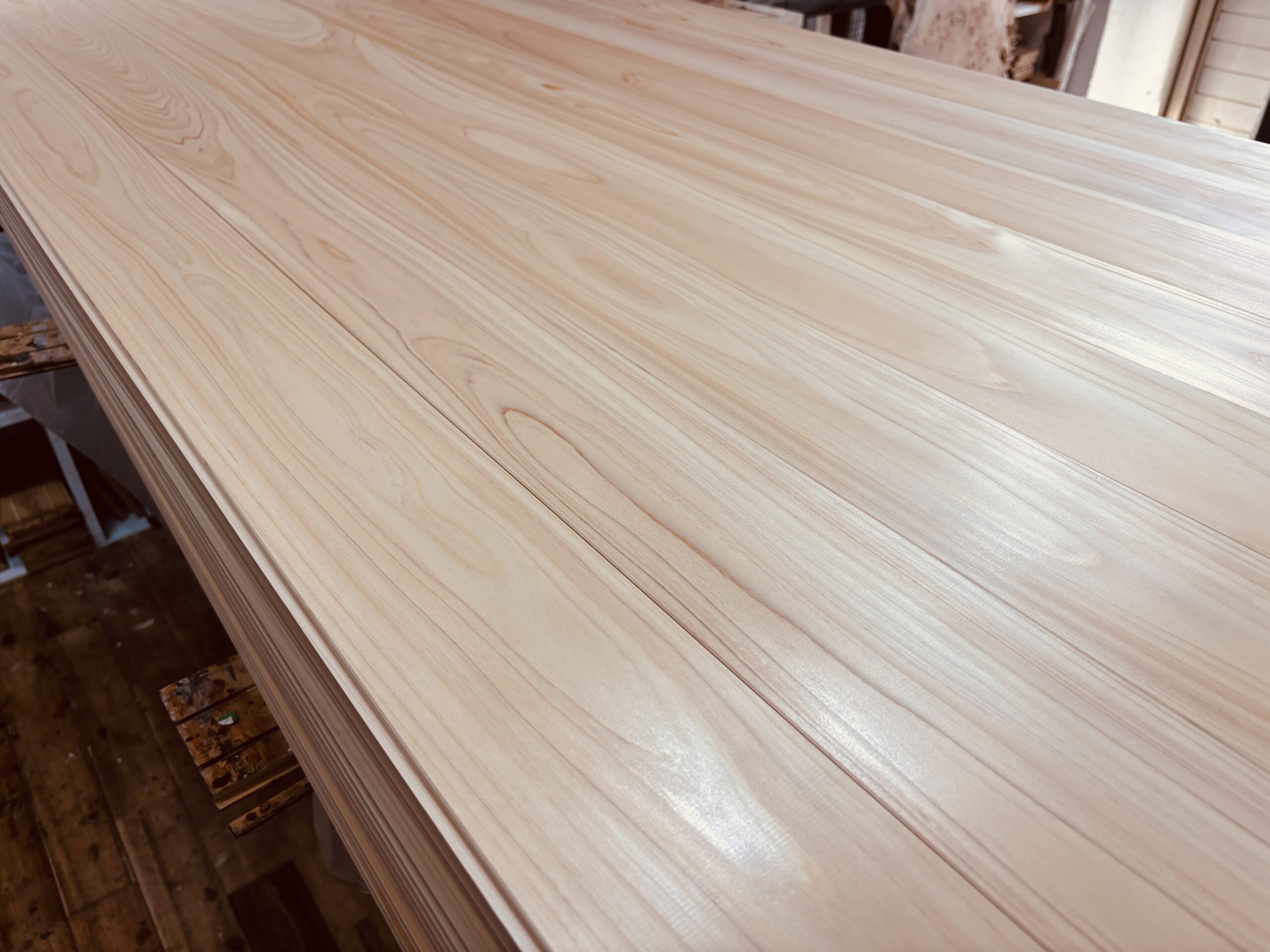 写真のような艶でよくあるのが、仕上げの切削面がきれいなケースです。超仕上げカンナや良いプレーナーで出した面は、繊維がスパッと切れて寝やすく、光が揃って返ります。