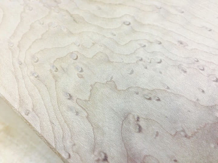 淡い乳白色のメープルの中に、無数の小さな“目”のような杢が浮かび上がるこの表情は、偶然の産物でありながら、人工では再現できません。家具材や楽器材として高級材に分類される理由は、その希少性だけではなく、光の受け方によって立体的に揺らぐ独特の存在感にあります。