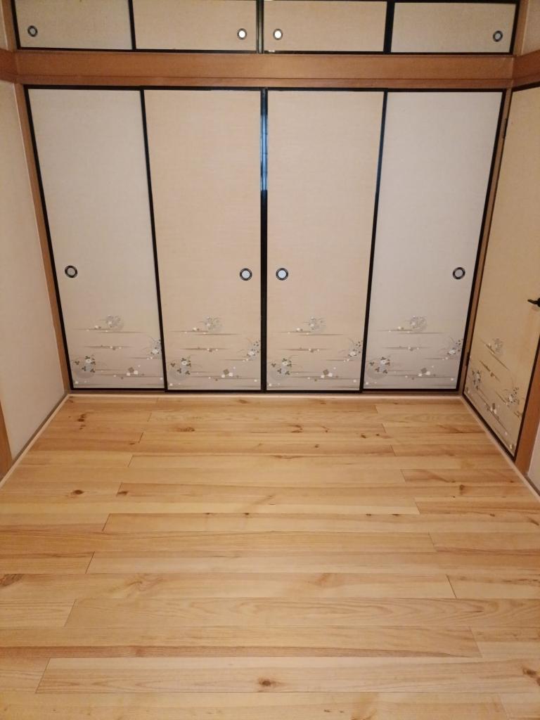 施工後にお送りいただいたお写真からも分かる通り、ボルドーパインの柔らかな木目と節は、和室の障子や木枠との相性が非常に良い樹種です。