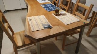 一枚板としてテーブルになると、その存在感は圧倒的です。しかし決して威圧的ではありません。ケヤキ特有のあたたかみのある色味と滑らかな質感が、空間に自然に溶け込みます。木は素材でありながら、空間の主役にもなります。このケヤキはまさにその両方を備えた一枚でした。