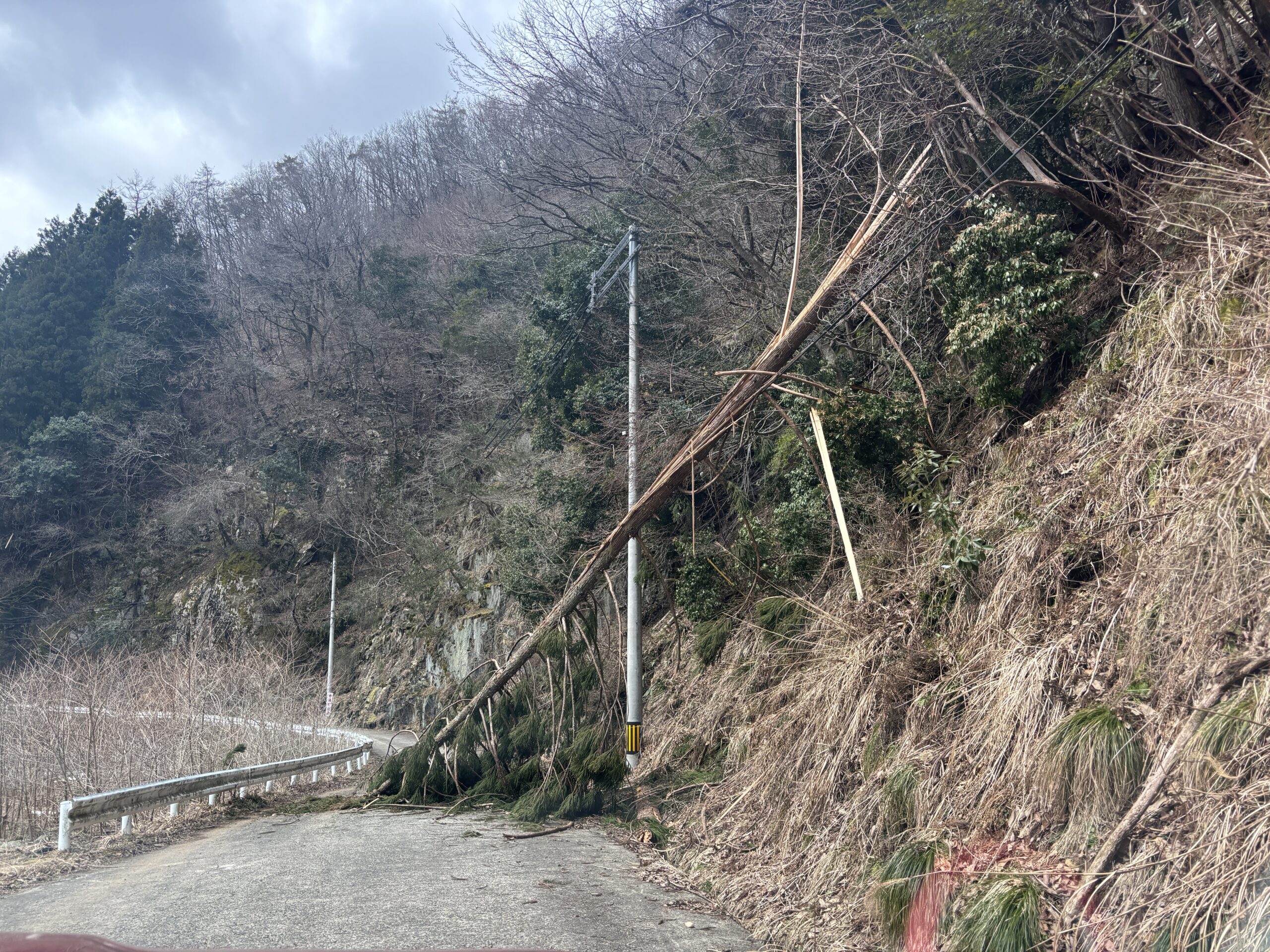 山道を進んでいると、突然視界に入ったのは、道路に倒れ込んだ大きな木。