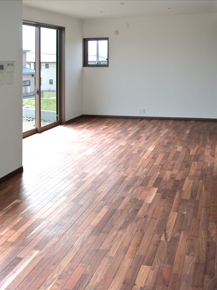このプロジェクトでは、ブラックウォルナットのユニ無垢フローリング【プレミアム】が採用され、ウレタン仕上げ(透明つやあり)で仕上げられました。施工に際して、特に床暖房対応という点を考慮し、木材の寸法安定性を最優先にしました。