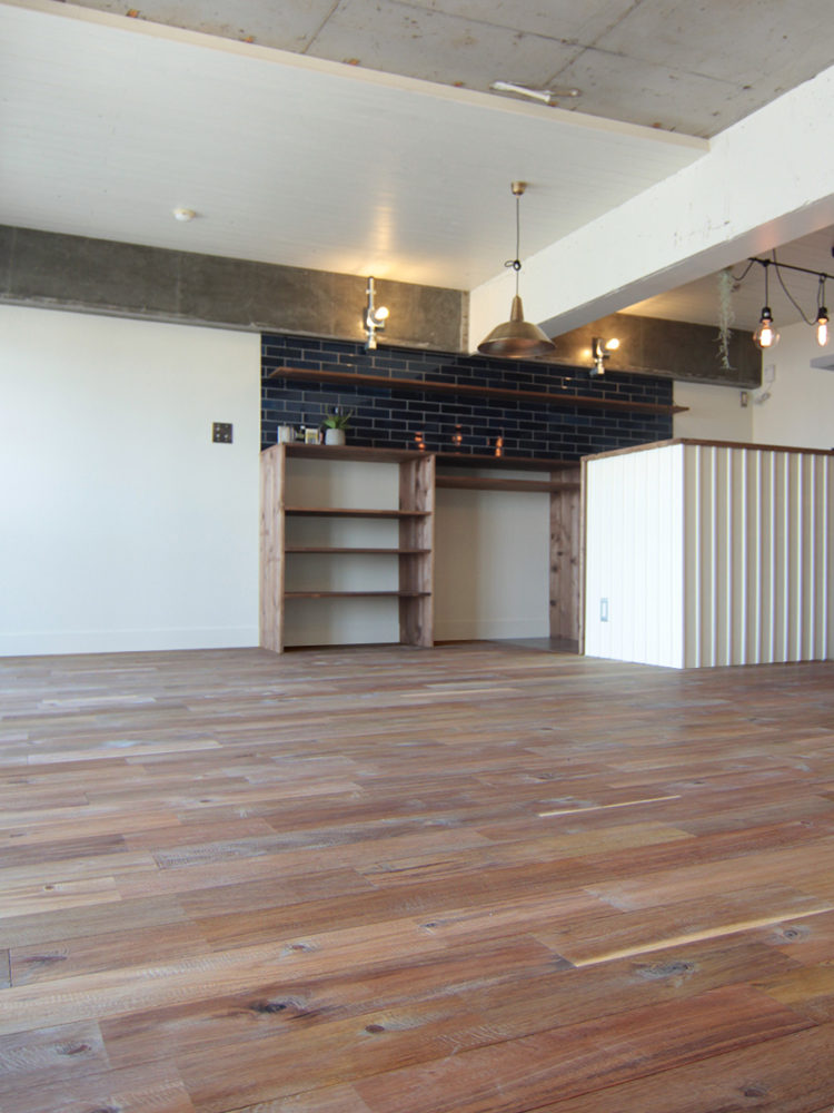インダストリアルデザインに映える、ヴィンテージ加工アカシアの床