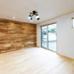 リビング:壁面にヴィンテージ加工アカシアを使用。視覚的にも主役となるアクセントウォールとして機能します。