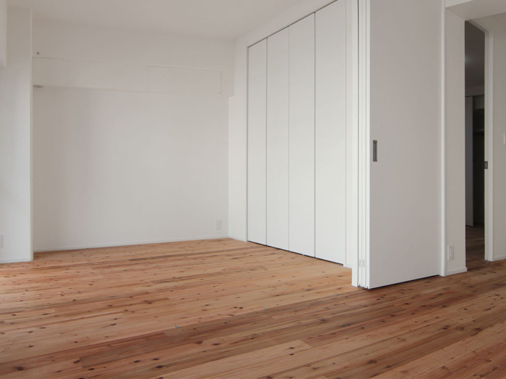 施工後の室内は、真っ白でシンプルな壁に、有機的な表情を持つ奈良県産吉野杉の床材が絶妙なコントラストを生み出していました。