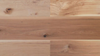 ヒッコリーの最大の魅力は、濃淡の激しい色合いと力強い杢目です。明るい部分はややクリーミーなトーンを持ち、濃い部分はダークブラウンやグレーが混ざり合い、空間に動きと奥行きを与えてくれます。ラスティックグレードでは、節や荒々しい表情が強調され、無骨ながらもクールで洗練された印象を演出できます。