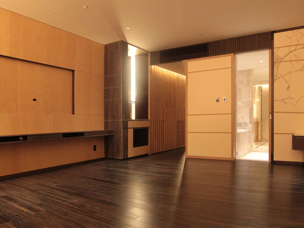 床材は、空間全体の印象を大きく左右する重要な要素です。今回採用されたオーク複合フローリングは、浮造り加工やワイピング仕上げといった職人の手仕事を活かしながら、施工条件に応じた直貼り対応仕様を実現したことで、京都の美意識とホテルのラグジュアリー感を見事に両立させました。