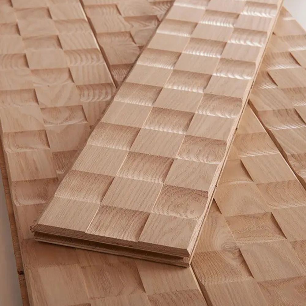 規則性のあるパターンでありながら、木目の向きや色味の違いによって一枚一枚の表情が変わります。幾何学と自然素材が融合した加工です。