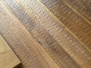 細かな生活傷は入りますが、木目が流れるように入っているため、線として目立ちにくい傾向があります。使い込むことで艶が出て、床全体に馴染んでいきます。