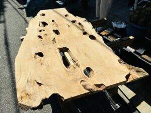 オリーブは一枚板の状態ですでに情報量が多い木です。