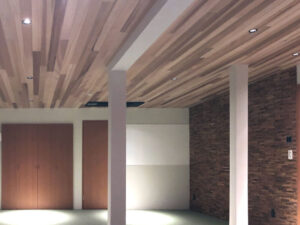 はい。軽量なため、天井材として非常に相性が良い樹種です。壁と天井を同材で仕上げることで、空間に包まれるような一体感が生まれます。