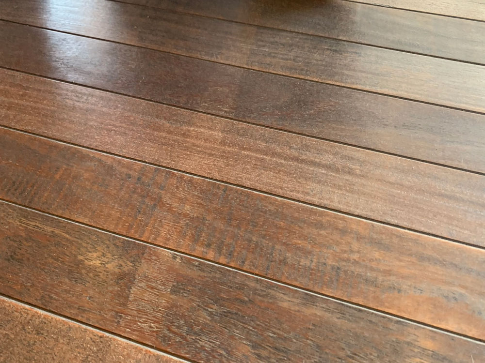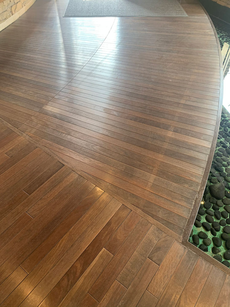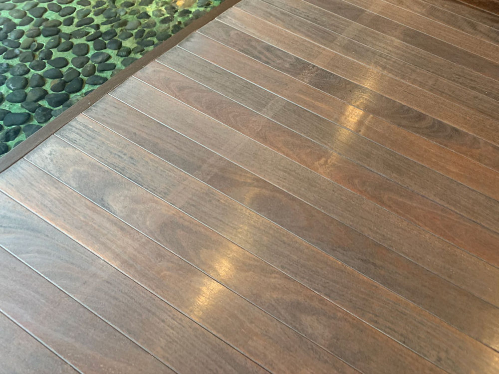 正直に言えば、今回の現場で使用されていた樹種に関しては正確な情報が残っていませんでした。管理組合様も詳細を把握されておらず、図面や記録からも明確なデータは得られません。しかし、木目や硬さ、色味などから推測すると「クマル」である可能性が高いと考えられます。クマルは非常に硬質な南米産の木材で、耐久性が高く、公共施設や商業施設でも多用される人気のある樹種です。