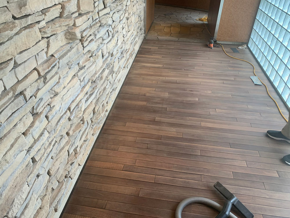今回のエントランスも長年にわたり土足で使用されてきましたが、木材自体に大きなダメージは見られませんでした。クマルの高い硬度と耐摩耗性が、長期間にわたり美観を維持してきた要因だと考えられます。